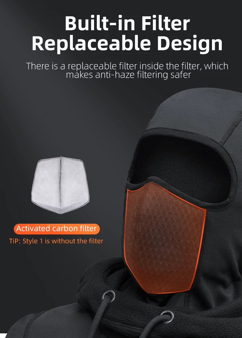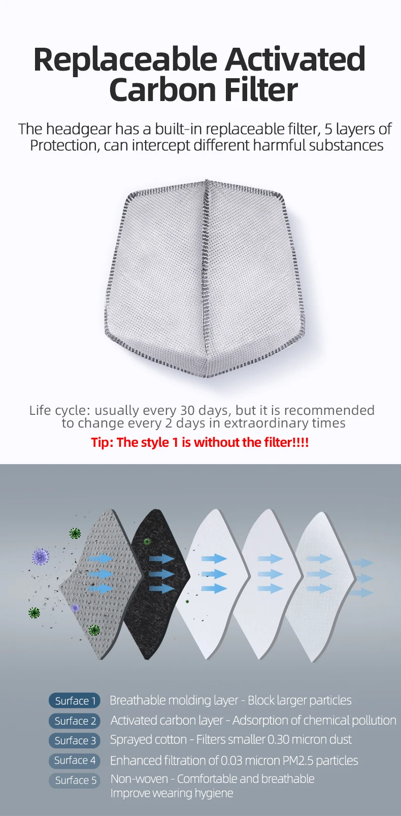 The headgear has a built-in replaceable filter, 5 layers of Protection, can intercept different harmful substances.